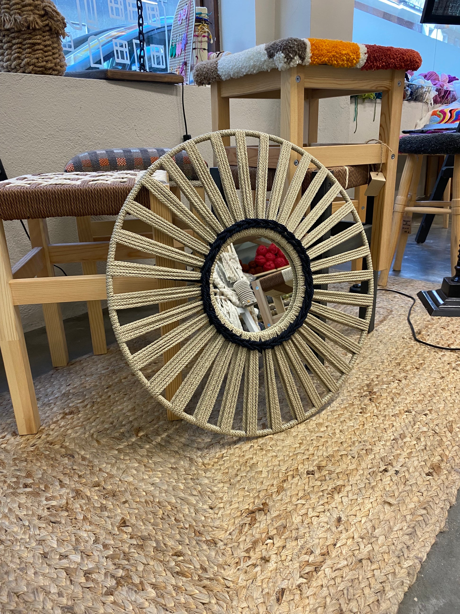 Taller Encordado de espejo con un diámetro total de 50 cm, en el centro un espejo de 20 cm de diámetro. Prepárate para disfrutar de un taller en donde harás magia con tus manos.